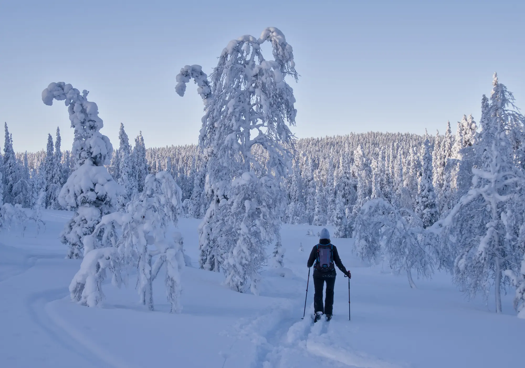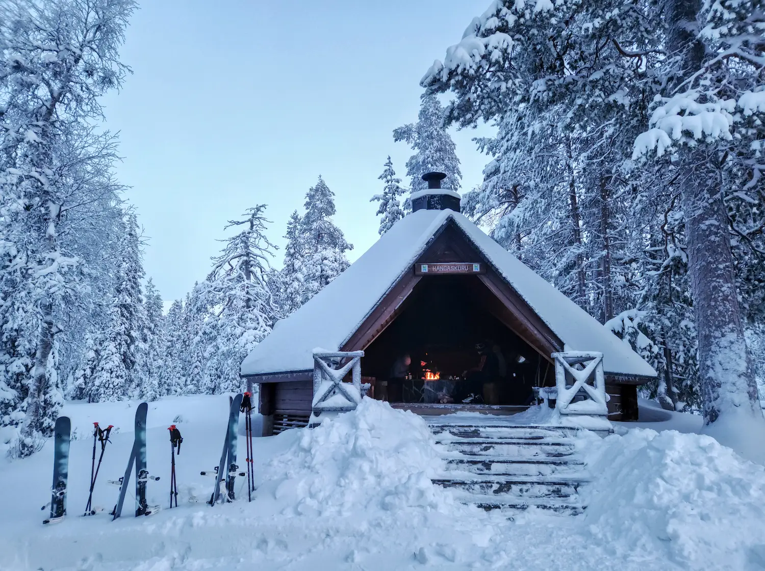 Winter temperatures in Lapland usually range between -5°C and -25°C, but colder days are possible. The air is dry, and because backcountry skiing keeps you moving continuously, most people stay warm with proper clothing. We also take breaks when needed, including a stop at a forest shelter with a fire to warm up.